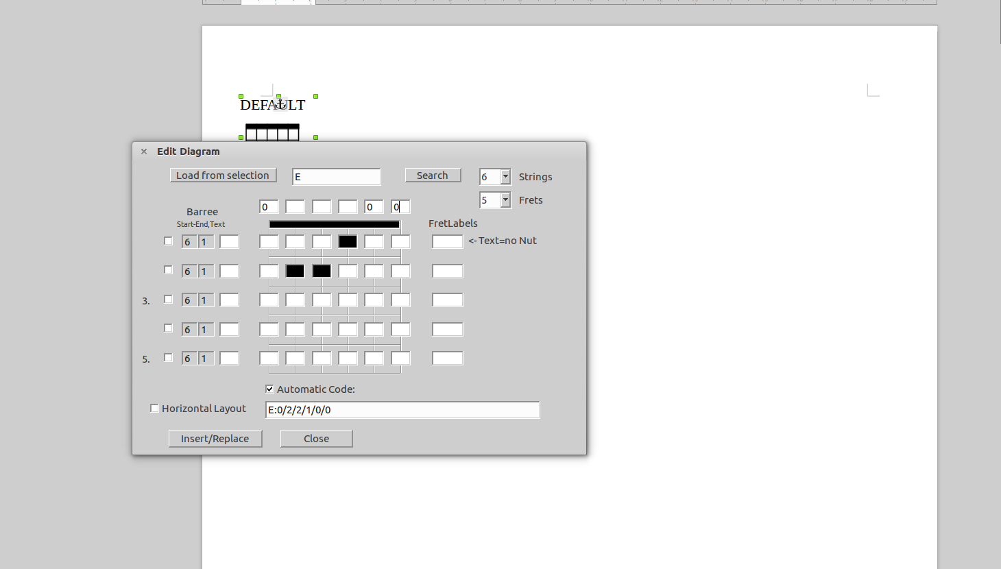 Für die Ersteingabe eines Gitarrenakkords muss man zunächst die Syntax des Akkord-Editors kennen. Die haben wir fragmentarisch irgendwo im Netz gefunden. Kennt man die Syntax nicht, lässt man einfach den DEFAULT-Akkord darstellen, der ein leeres 6-Saiten-Schema darstellt. Dieses muss man dann markieren (es ist technisch betrachtet eine Grafik) uns dann aus dem Chorddiagram-Menü (s. Abb. 1) den Punkt Edit aufrufen.